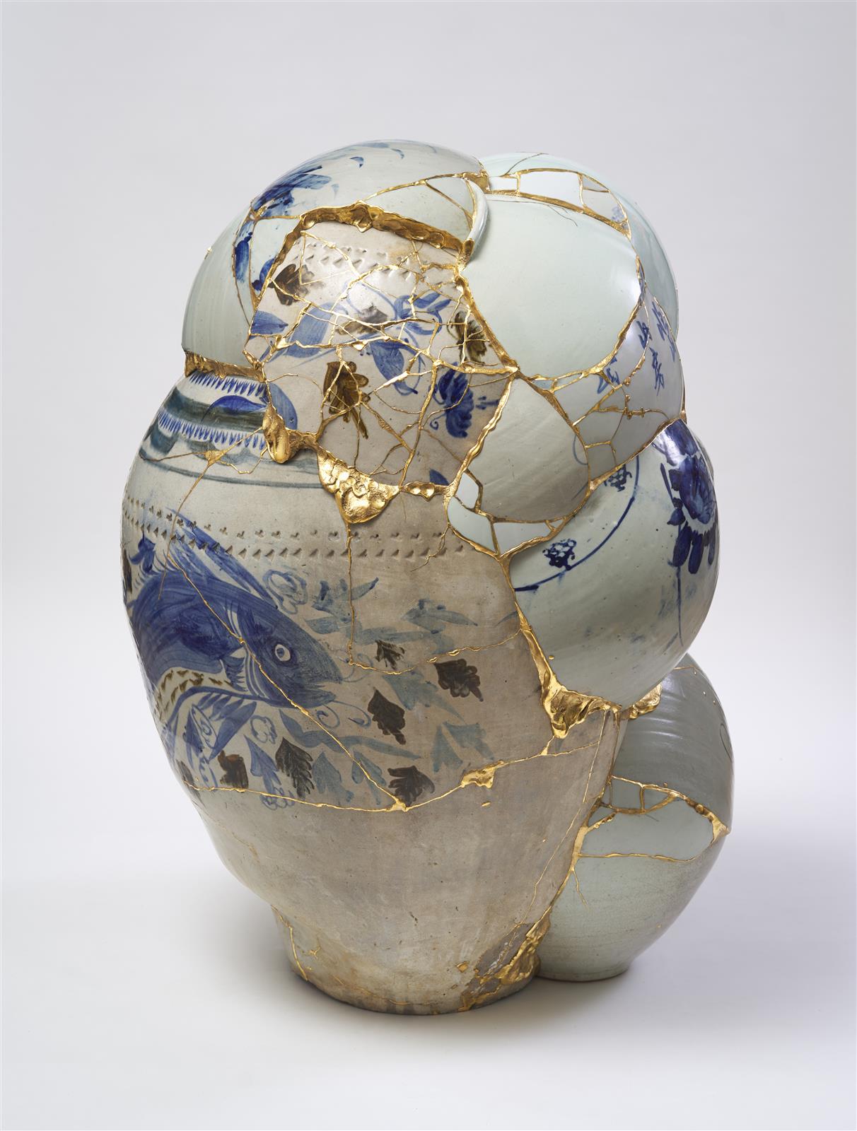 《转换花瓶》(Translated Vase)系列是由废弃的瓷器碎片重组而来的雕塑作品。技艺精湛的陶艺大师制作了韩国传统陶瓷的复制品,并销毁了有小瑕疵的花瓶,以保持其现存杰作的价值及稀缺性。作者用三维拼图的方式把这些被销毁的碎片拼起来,用黄金把裂缝盖住。从它们被销毁的那一刻起,作者就有机会通过自己的演绎方式来干预和创造新的故事。