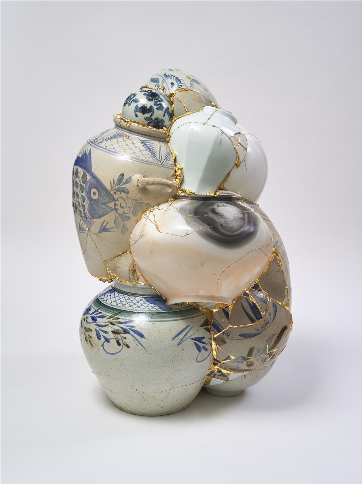 《转换花瓶》(Translated Vase)系列是由废弃的瓷器碎片重组而来的雕塑作品。技艺精湛的陶艺大师制作了韩国传统陶瓷的复制品,并销毁了有小瑕疵的花瓶,以保持其现存杰作的价值及稀缺性。作者用三维拼图的方式把这些被销毁的碎片拼起来,用黄金把裂缝盖住。从它们被销毁的那一刻起,作者就有机会通过自己的演绎方式来干预和创造新的故事。