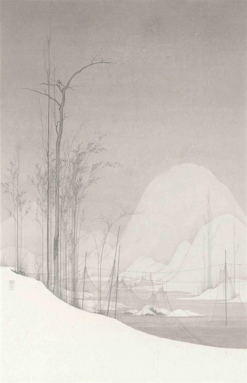 大抵在寒冬季节,黄昏时分,风雪初歇。秃树兀立,枯草横斜,一江瘦水隔开两岸,一带远山似有若无。天空没有飞鸟,树上没有绿叶,路上没有行人,却有一丝静穆,随江水漫渡,与淡烟暮霭相遮蔽,渐渐融合在一起,真实而又虚幻。在宁静中拒绝外在的喧嚣,在幽远处淡化不安的躁动,汲取这冰雪纯净的余光照亮远方的路程。