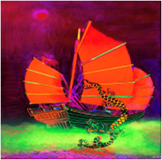 我对古迹的热爱、对经典传统作品的研究以及对生活感官的追求,让我想要透过中国的技术来展现每一种元素的本质:当代世界中的岩石、树木、水、人物。它们是既有发展前景又具有传统价值的元素。作品明亮的色彩(现代城市夜景的特徵)以及其在黑光下的曝光,彰显其色彩强度,同时又赋予了如根植於古希腊绘画的视角的西方价值观。传统要麽被传承,要麽被颠覆。夸张的色彩与中国传统形式相协调,在某种意义上吸引了观众,使其主动沉浸到作品中。这一作品以梦幻般的现代社会的强度来突出传统的精神层面,成为中西文化对话的基本前提。