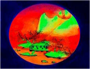 我对古迹的热爱、对经典传统作品的研究以及对生活感官的追求,让我想要透过中国的技术来展现每一种元素的本质:当代世界中的岩石、树木、水、人物。它们是既有发展前景又具有传统价值的元素。作品明亮的色彩(现代城市夜景的特徵)以及其在黑光下的曝光,彰显其色彩强度,同时又赋予了如根植於古希腊绘画的视角的西方价值观。传统要麽被传承,要麽被颠覆。夸张的色彩与中国传统形式相协调,在某种意义上吸引了观众,使其主动沉浸到作品中。这一作品以梦幻般的现代社会的强度来突出传统的精神层面,成为中西文化对话的基本前提。