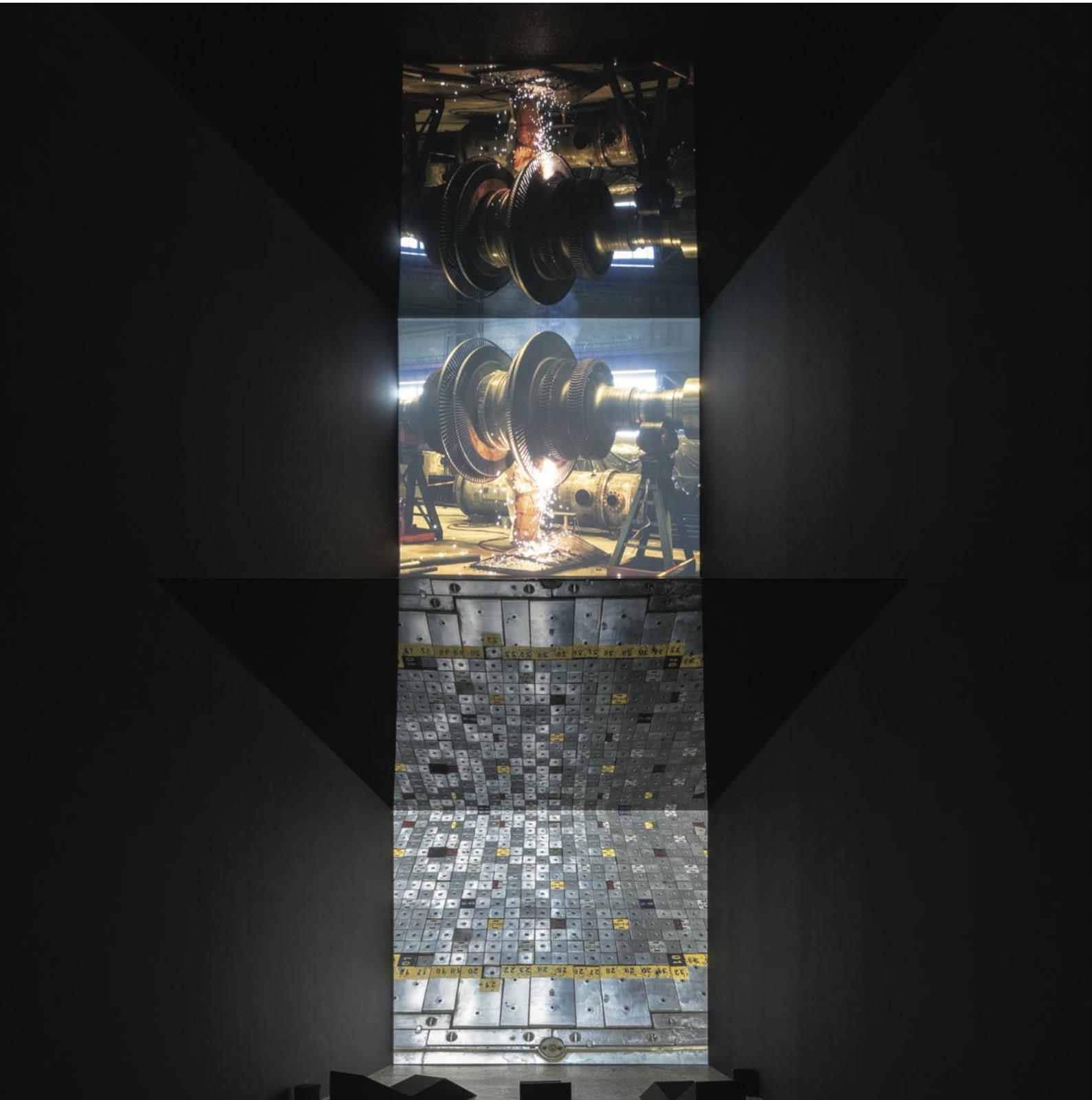 Škarnulytė试图以她的作品给世界敲响警钟,她带领观众穿梭於伊特鲁里亚墓地、立陶宛核电站(切尔诺贝利的同期核电站)、日本超级神冈探测器、反物质工厂、欧洲核子研究中心的大型强子对撞机、杜加雷达以及北极圈上冷战时期的潜艇基地,将过去与未来串联起来。《t1⁄2》展示的一切大於人类、大於生命——迫在眉睫的气候灾难、自然现象、意识形态的构建、庞大的科学结构、近代的地缘政治进程以及我们所知道的人文知识。而这一切都给我们的地球留下难以抹去的伤疤。