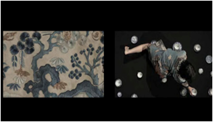 《青》展示了一个舞者在黑色背景下穿过一个黑暗的房间时所画的运动线。它象徵着一段旅程,一段从左到右、从西到东的运动。路程中,舞者遇到了神秘的物品。这些物品象徵着这一路上的障碍物,隐射了20世纪30年代时的前卫舞者的生活故事。《青》一方面表现了舞者舞动时身体会因踮脚而拔起,另一方面讲述了那些无法逃脱的被迫害者的连根拔起。舞者作为一个代表,以回溯的方式踏上了这段旅程,在一个没有参照物的空间里走着一条想像的道路。物品涌来。不仅是人和他们的身体会因为移动而发生变化,物品也会因为移动而发生变化。